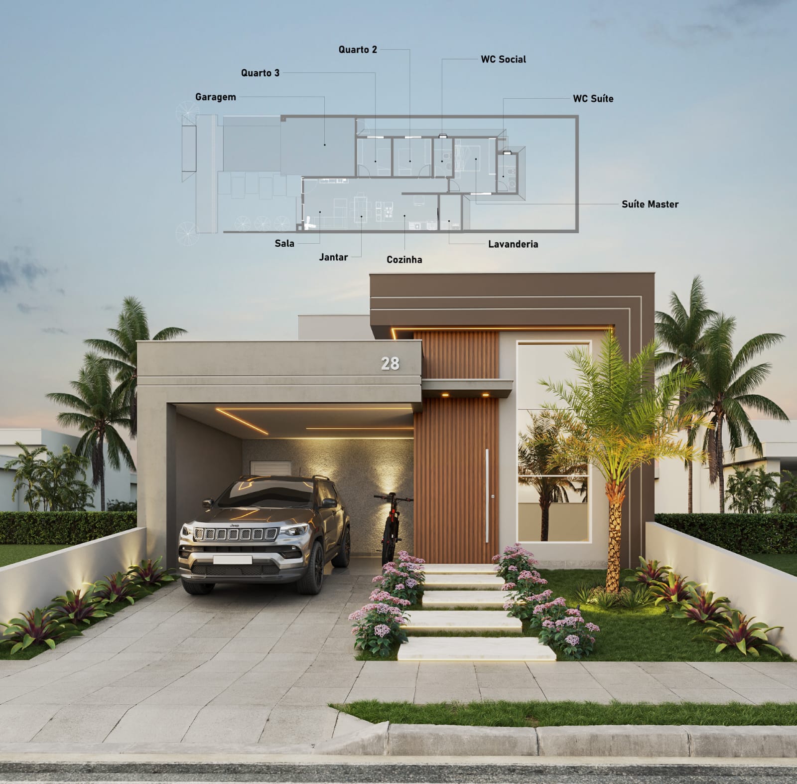 Casa em alvenaria, 3 dormitórios sendo 1 suíte, sala e cozinha integradas, banheiro social, piso em porcelanato, área de serviço e garagem coberta.Porta principal em painel ripado com fechadura digital. Espera para junker, gás central e caixa dágua de 1000L. Portaria e vigilância 24 horas. ACEITA FINANCIAMENTO!