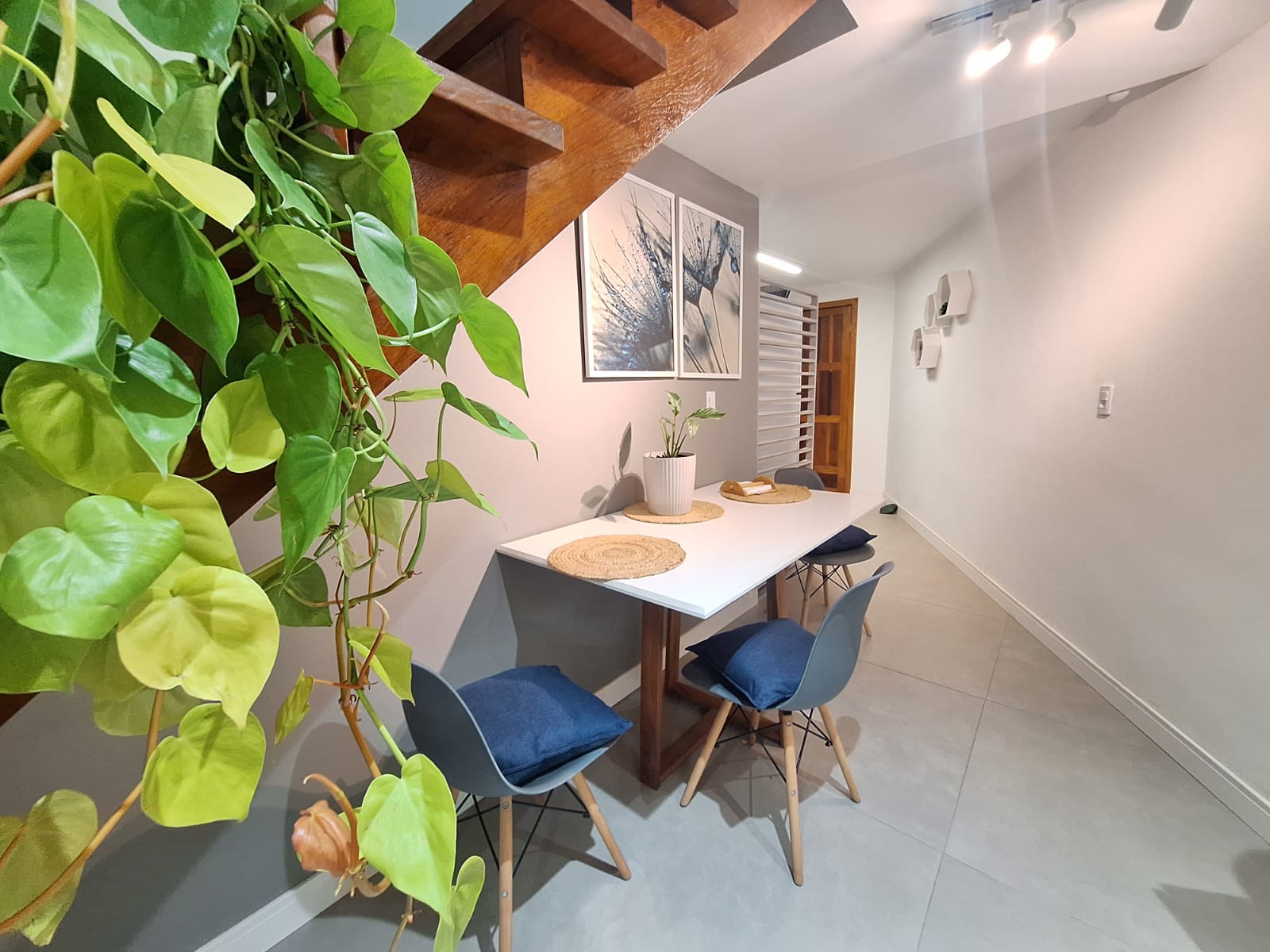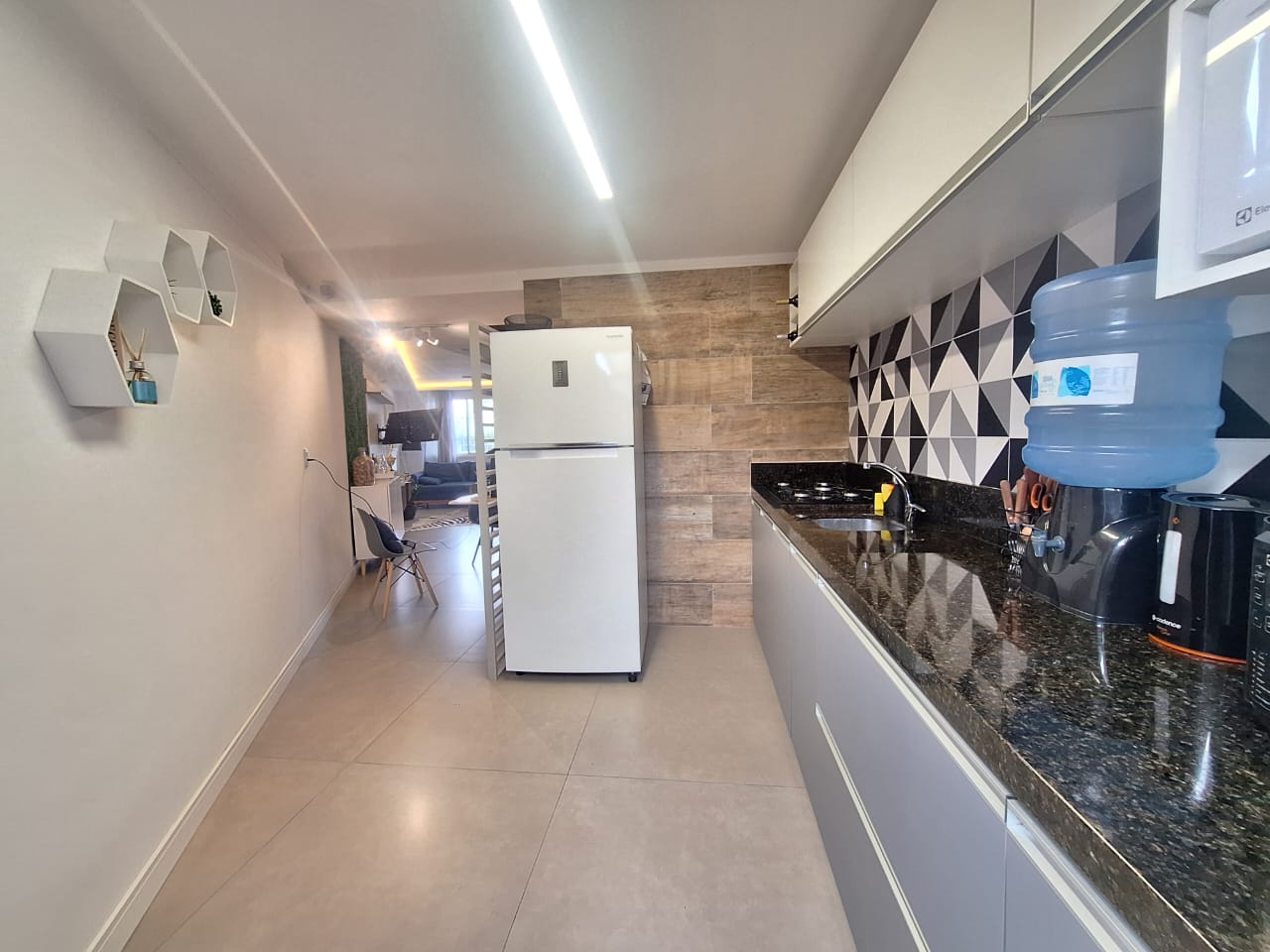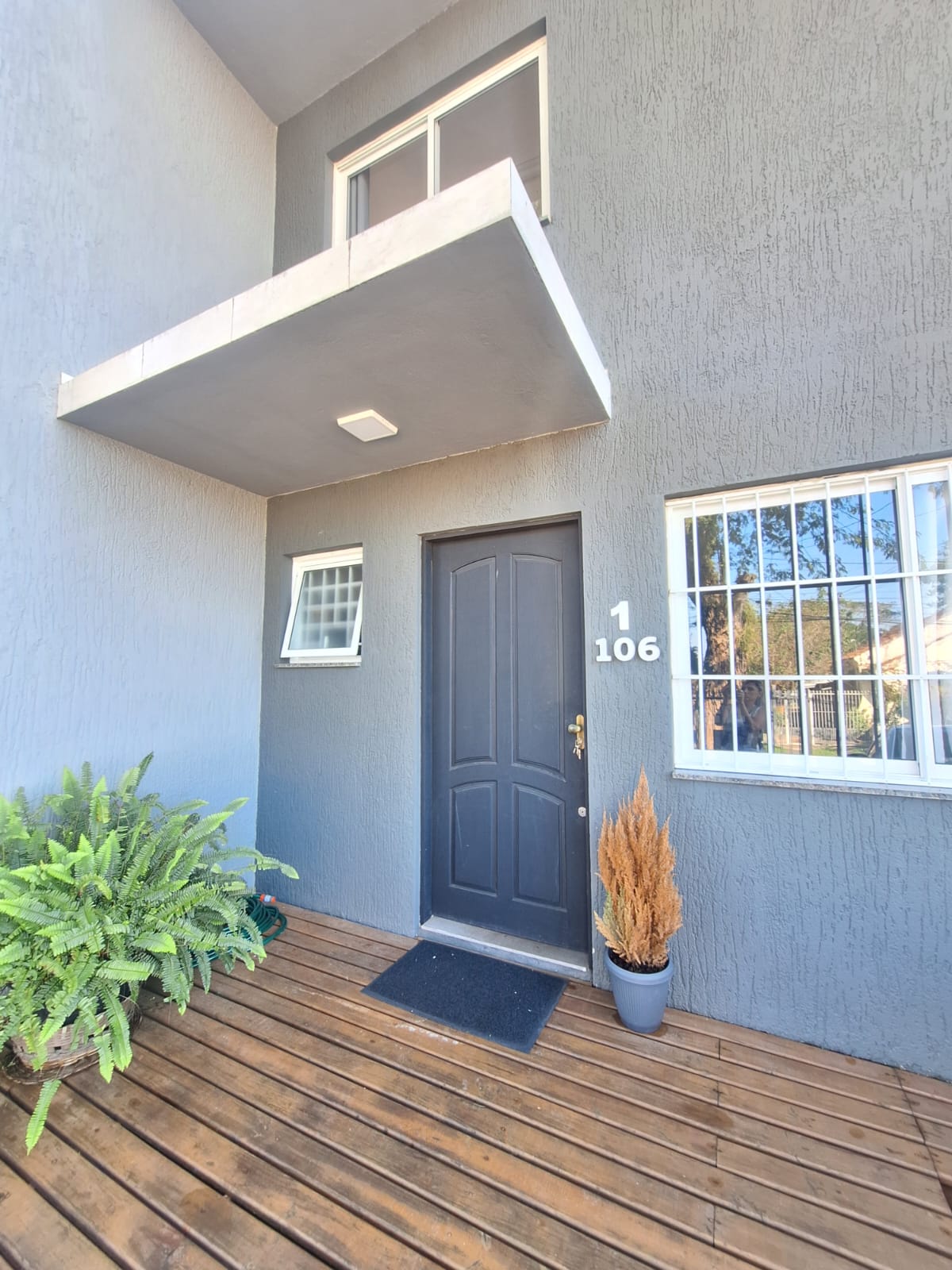 No primeiro pavimento, o sobrado dispõe de um charmoso deck de madeira na entrada, vaga para um carro, sala de estar e jantar integradas, cozinha funcional, lavabo e lavanderia.